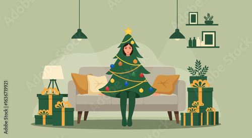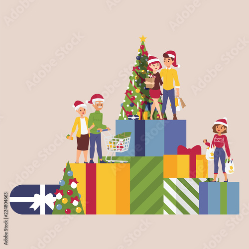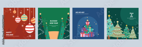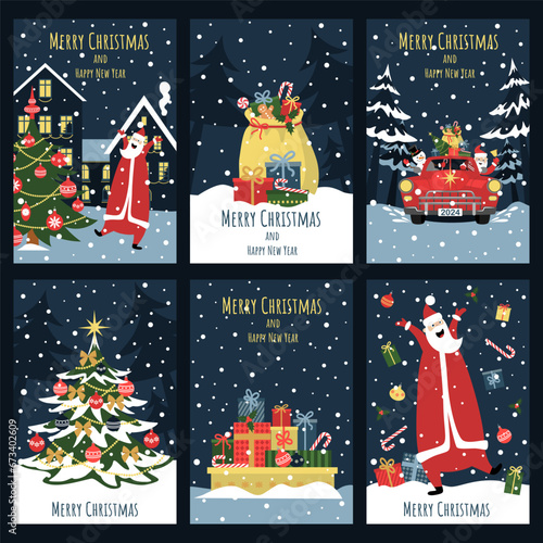 Vektorová sada plakátů, bannerů na silvestrovské oslavy. Šťastný Nový Rok, Sněhurka, strom s dárky a Santa designové prvky v plochém stylu.
