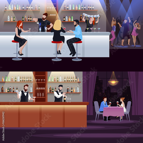 Vektorová sada plakátů s hudebníky vystupujícími na jevišti nočního klubu, disco klubu, v restauraci. Lidé tančí na hudbu plochý styl designových prvků.
