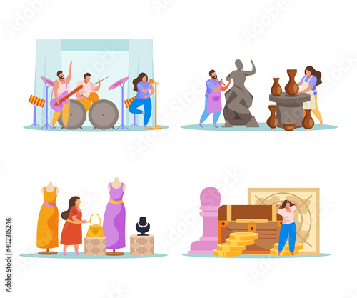 Vektorová sada ikon opera concept izolovaných na bílém pozadí. Herci, zpěváci, tanečníci, diváci postavy, pokladna a kavárna plochý styl designové prvky.