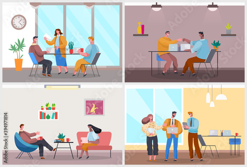 Vektorová sada konceptů orchestru plakáty, bannery. Hudebníci hrající hudbu a zpěv na jevišti koncertního sálu a venku navrhují prvky v plochém stylu.