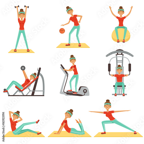 Vektorová sada lidí v tělocvičně postav izolovaných na bílém pozadí. Fitness a cvičení cvičení v tělocvičně. Ikony v plochém stylu izolované na bílém pozadí.