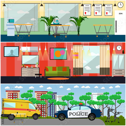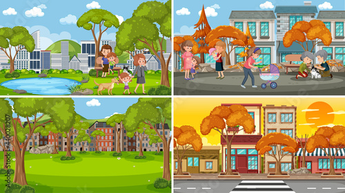 Vektorová sada plakátů pro domácí zvířata a zvířata v zoo, bannery. Venčení psa v parku, zverimexu a interiéru zoo s domácími a volně žijícími zvířaty, návštěvníky. Plochý design.