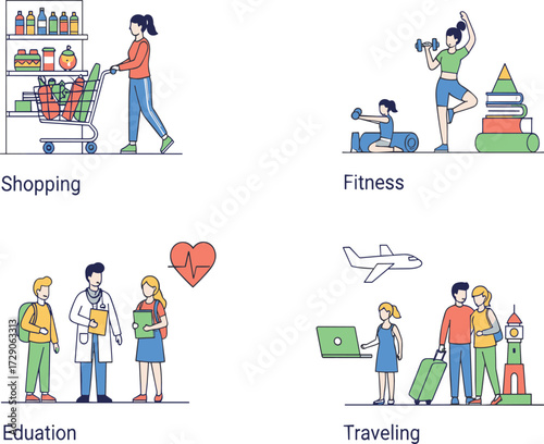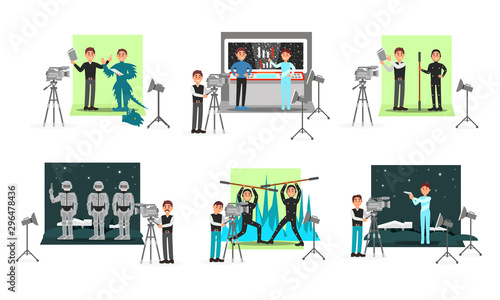 Vektorová sada fotografických a video konceptových plakátů, bannerů. Herec, fotit, kameraman, Rozhovor designové prvky v plochém stylu.