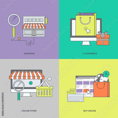 Vektorová sada nákupů koncepčních plakátů, bannerů. Pokladní, promotér, výrobky a zelenina designové prvky v plochém stylu.