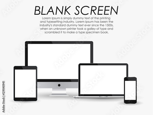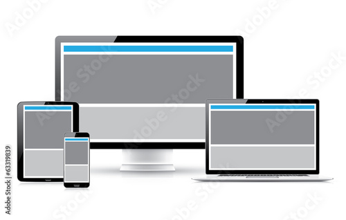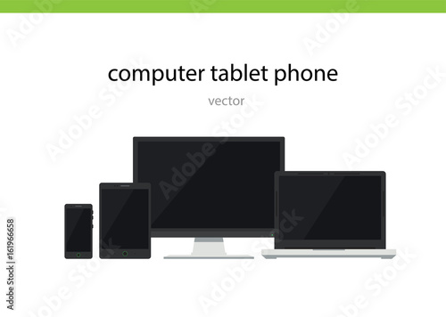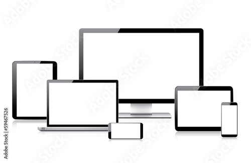 Vektorová sada realistických obrazovek 3D počítačových zařízení, tablet, Mobilní telefon, notebook. Izolované gadgety na bílém pozadí v různých vrstvách. Citlivé webové makety a šablony ilustrace
