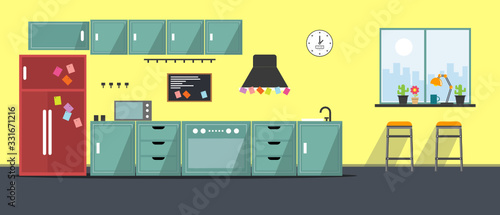 Vektorová sada interiérových plakátů restaurace kuchyně, bannery. Kuchyňské náčiní a spotřebiče, ploché designové prvky.