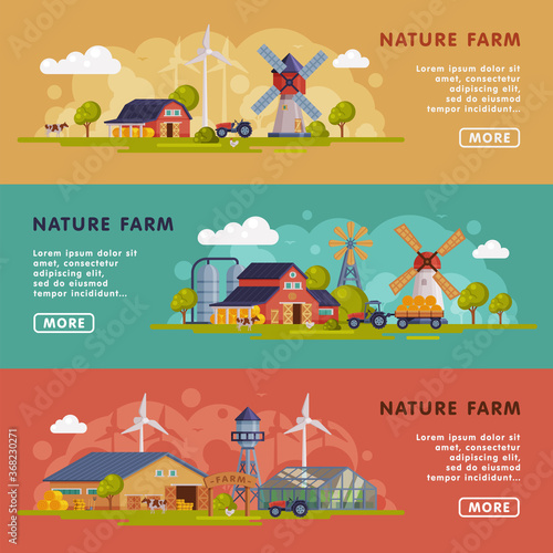 Vektorová sada vodorovných bannerů. Stabilní. Péče o koně, jízda na koni a výcvik koní plochý styl designových prvků.