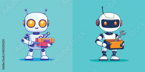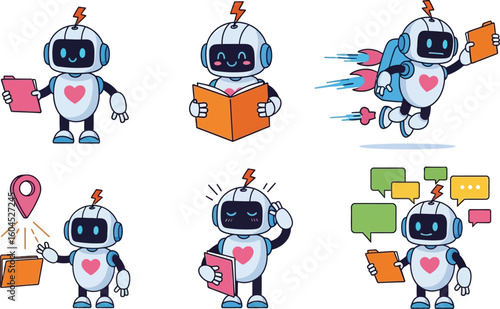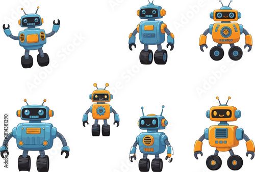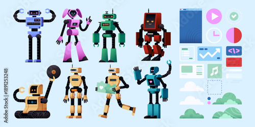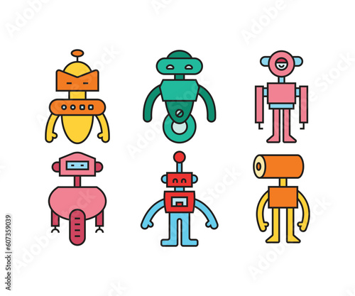 Vektorová sada kreslených robotů izolovaných na bílém pozadí. Barevné designové prvky, ikony v plochém stylu.