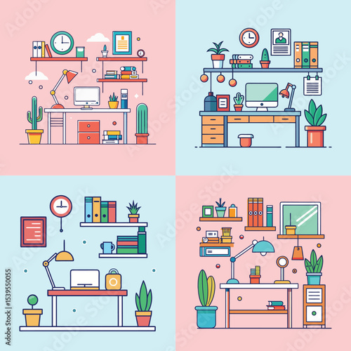 Vektorová sada školních objektů izolovaných na bílém pozadí. Školní ikony v plochém stylu, knihy, žáci, tabule, police, pero, školní stůl. Školní učebna s tabulí a psacím stolem.