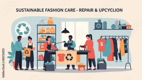 Vektorová sada prvků designu obchodů a supermarketů v plochém stylu. Lidé nakupují v obchodě s módním oblečením, supermarket, vybavení a obchod s elektronikou.