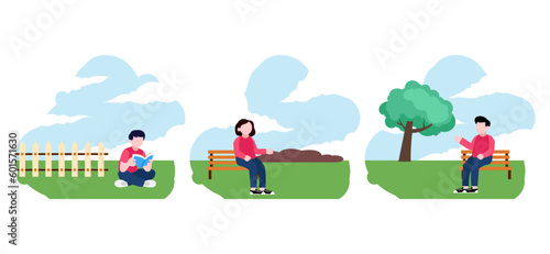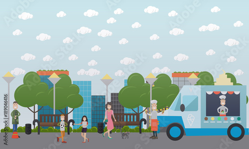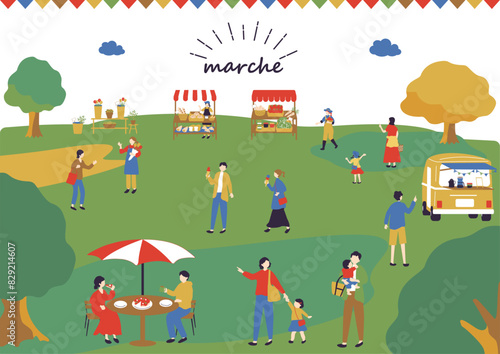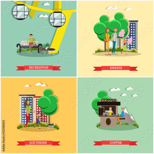 Vektorová sada plakátů na nákupním trhu, bannery v plochém stylu. Veranda, trh, řezník, street food designové prvky v plochém stylu. Lidé prodávají a kupují jídlo.