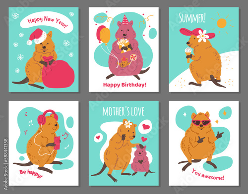 Vektorová sada jarních karet s lesními zvířaty a inspirativními citacemi. Roztomilý zajíček, ježek, jelen, sova, liška, veverka a medvěd s ptáky, jarní květiny, srdce, mraky.