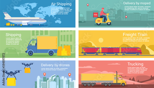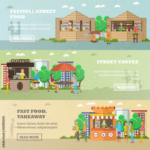 Vektorová sada horizontálních bannerů pouličního provozu. Krásný park na procházku, dopravní výměna a moderní prvky designu ulice v plochém stylu.