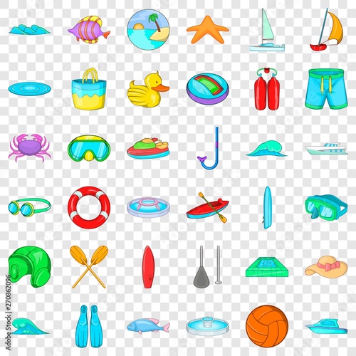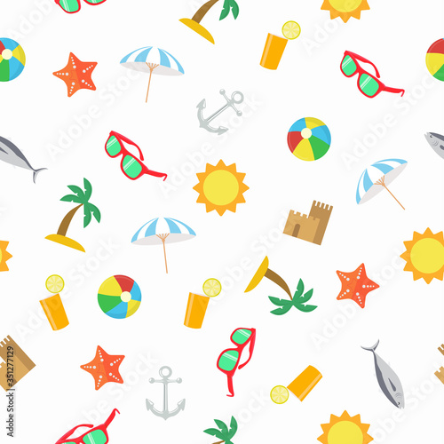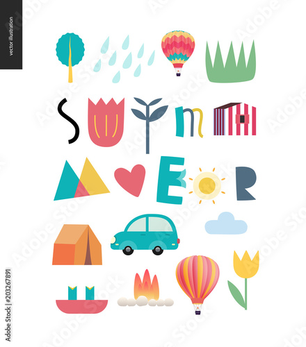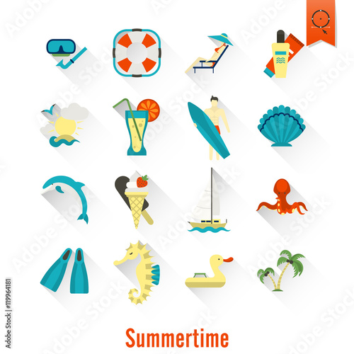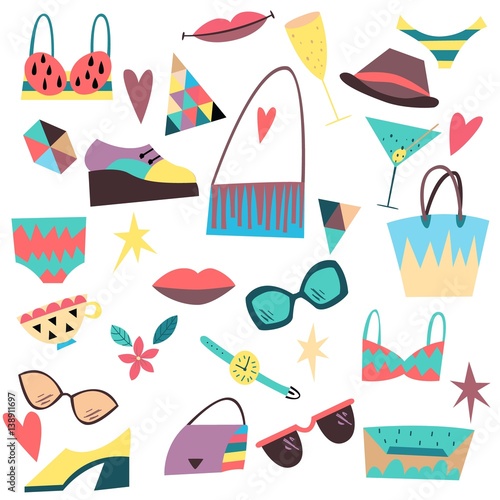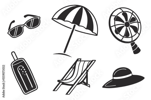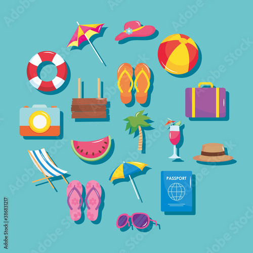 Vektorová sada letních objektů izolovaných na bílém pozadí. Designové prvky a ikony v plochém stylu. Koncept dovolené na pláži.