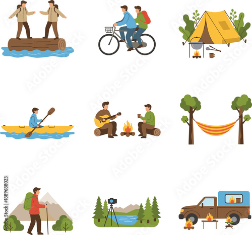 Vektorová sada letních outdoorových aktivit koncepční plakáty, bannery. Prvky designu potápění, badmintonu, Frisbee a kempování v plochém stylu.