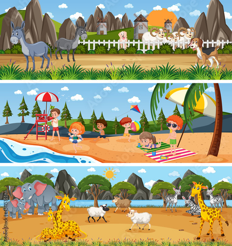 Vektorová sada letních outdoorových aktivit koncepční plakáty, bannery. Kempování, lezení po skále, surfování, potápění, jízda na kajaku, hraní frisbee a badmintonu, jízda na kole. Plochý design.