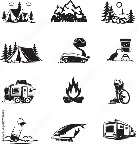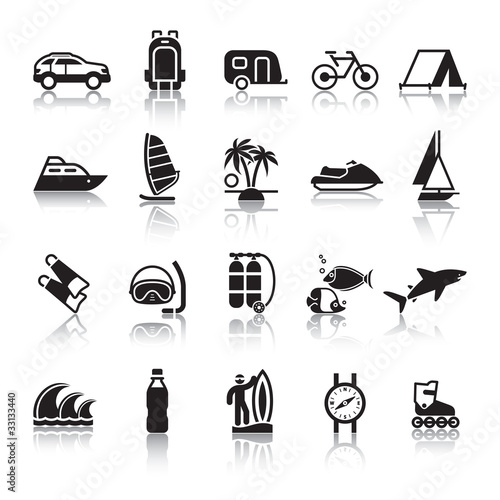 Vektorová sada letních prázdnin, výletní dovolená, výlet, jízda na kajaku a surfování vodní sporty vintage monochromatická loga, emblémy, štítky a odznaky.