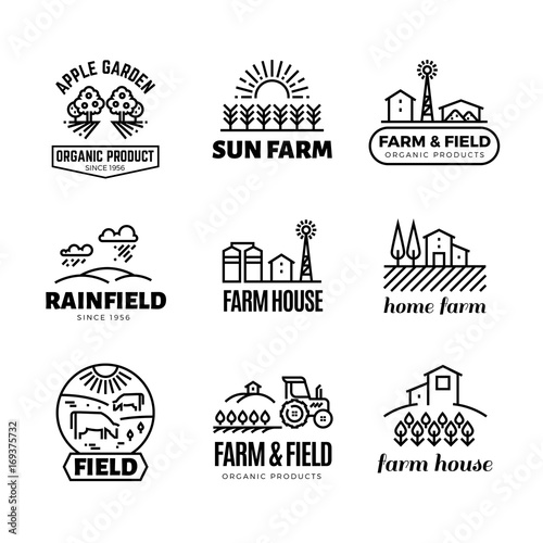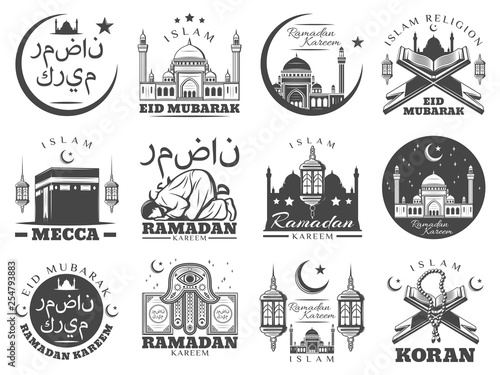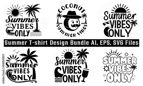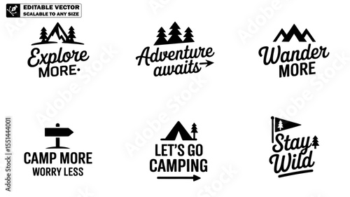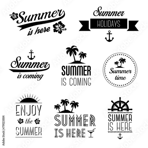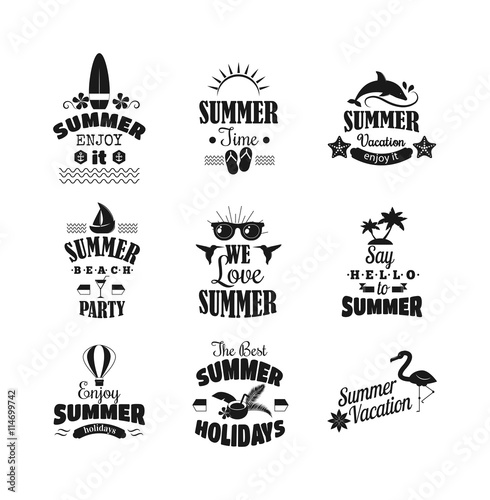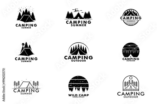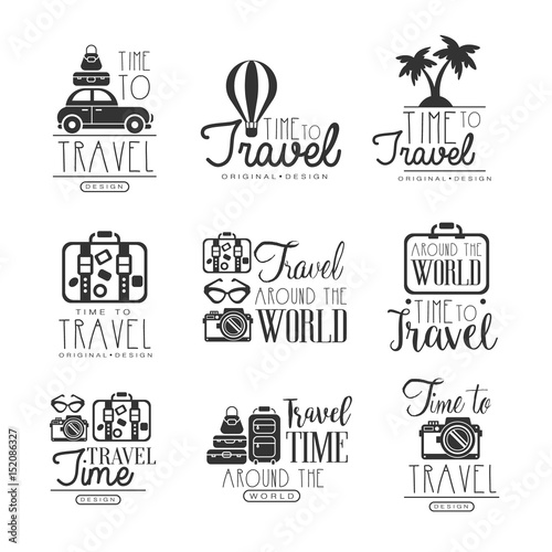 Vektorová sada letního tábora, výlet autobusem, plážová párty, tropická dovolená vintage loga, emblémy, štítky a odznaky. Černobílá monochromatická ilustrace v retro stylu.