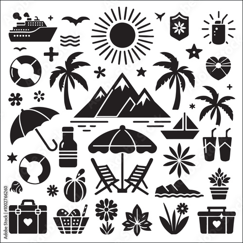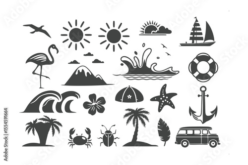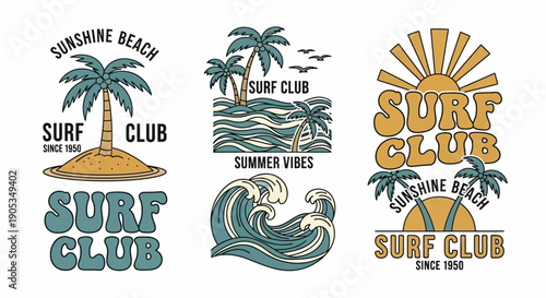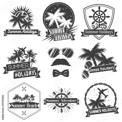 Vektorová sada letního dobrodružství, dovolené na pláži, noční párty, surfování vintage loga, emblémy, štítky a odznaky. Černobílá monochromatická ilustrace v retro stylu.