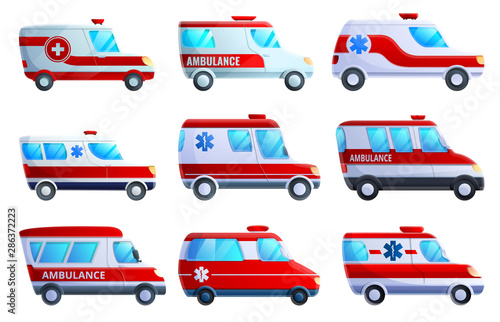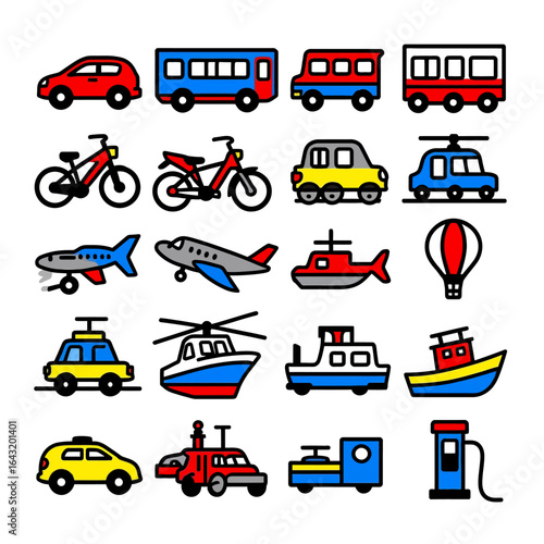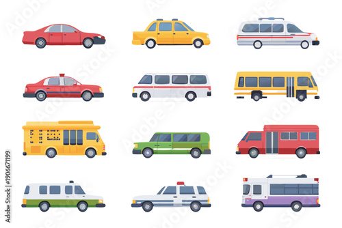 Vektorová sada izolovaných transportních ikon. Hasičský vůz, sanitka, policejní auto, kamion pro přepravu vadných aut, školní autobus, taxi