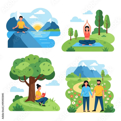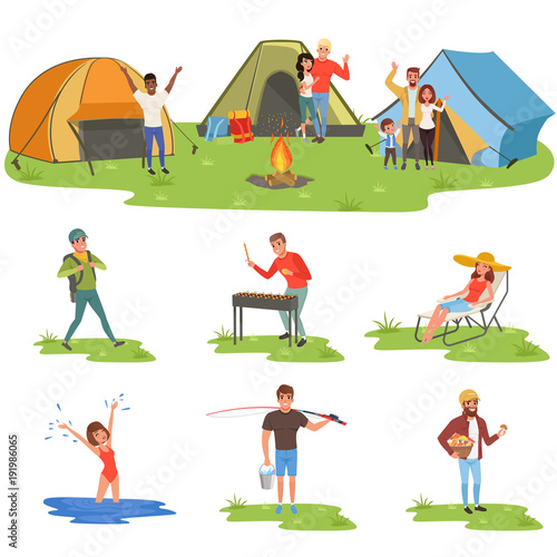 Vektorová ilustrace cestovatelů, kteří jdou na turistiku, kempování. Turistické symboly lidí, ikony izolované na bílém pozadí. Plochý design.