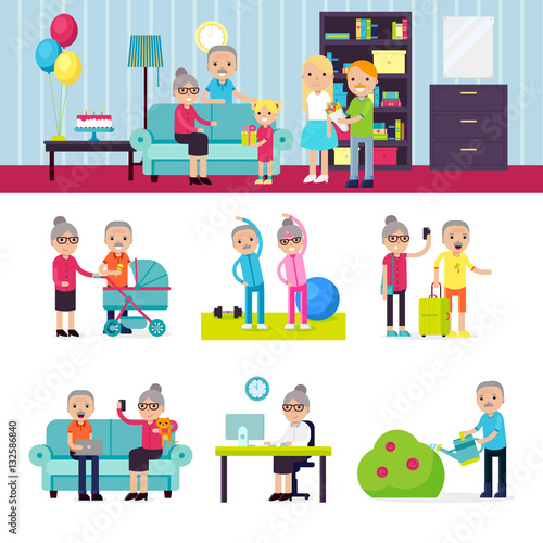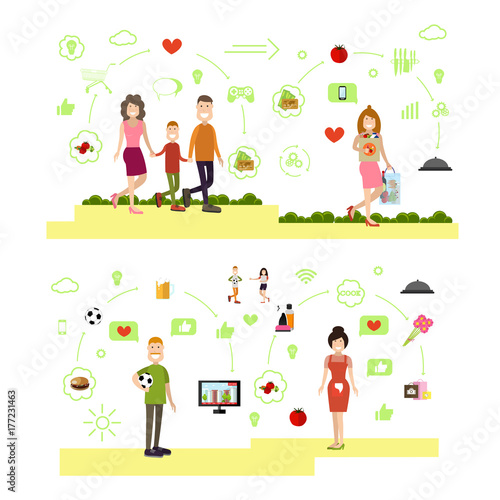 Vektorová ilustrace cestujících jsou fotografovány se zvířaty v zoo, fotografování přírody, pořizování selfie. Turistické symboly lidí, ikony izolované na bílém pozadí. Plochý design.