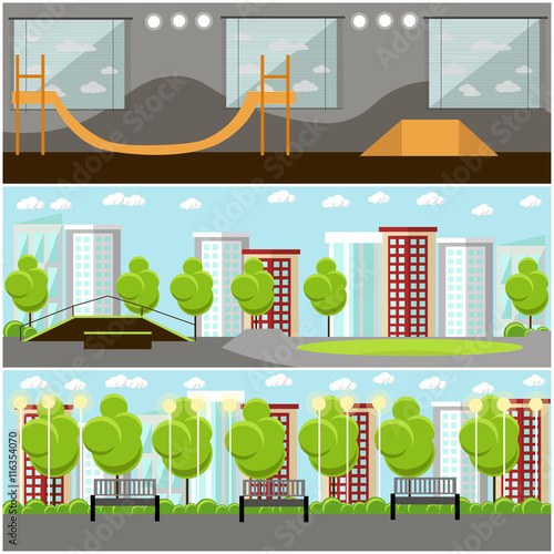 Vektorová sada plakátů, bannery se skate parkem a rampou, cyklostezka v parku, moderní prvky designu Street transport flat style.