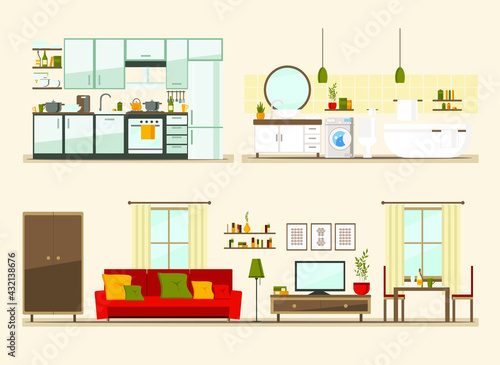 Vektorová sada univerzitních interiérových plakátů, bannerů. Učebna, přednáškový sál, knihovna, laboratoř, jídelna, disco club designové prvky v plochém stylu.