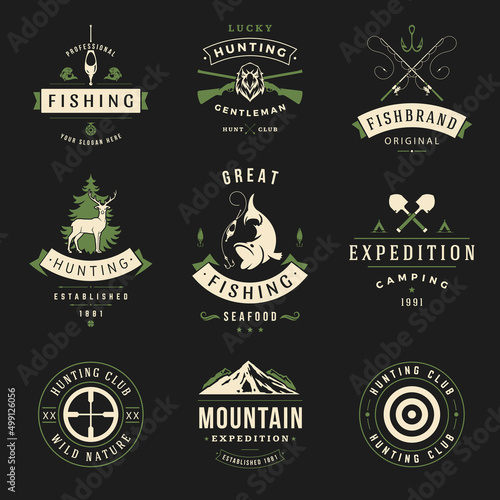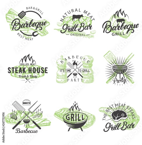 Bbq a gril znak, logo, štítek a odznak set, vektorové ručně kreslené ilustrace v retro stylu. Steak house restaurace menu, barbecue party, grill bar vintage typografie design.