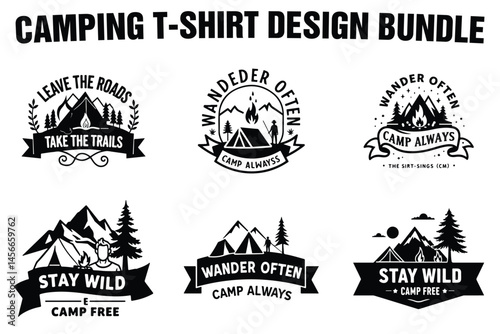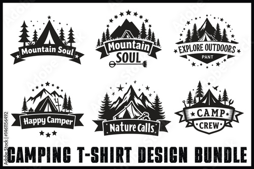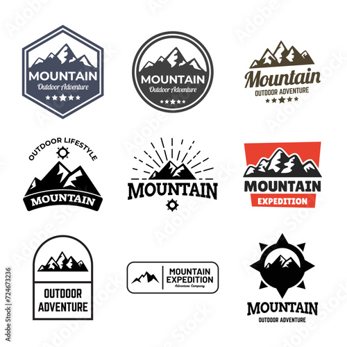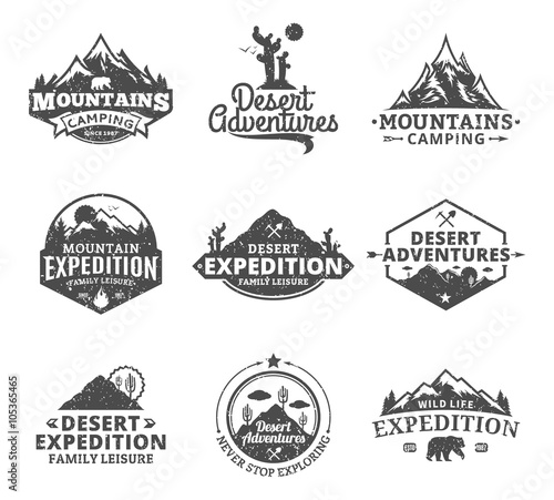 Venkovní štítek, znak, odznak a logo set, vektorové monochromatické ilustrace ve vintage stylu. Horská expedice, dobrodružství na cestách, kempování, horské výlety, výlety na kajaku, nápis forest camp.