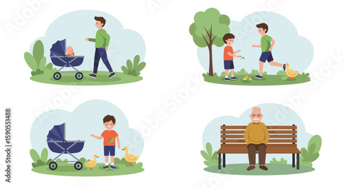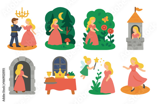 Vektorová sada svatebních plakátů. Stolní dekorace, svatební dort, tanec a scenérie plochý styl designové prvky.