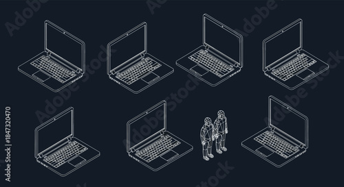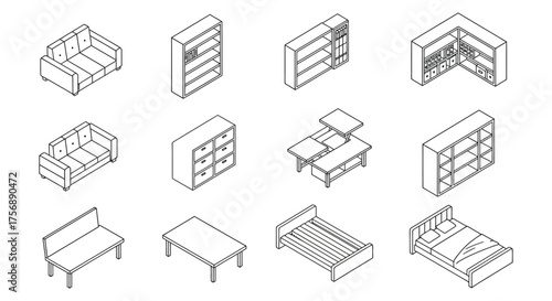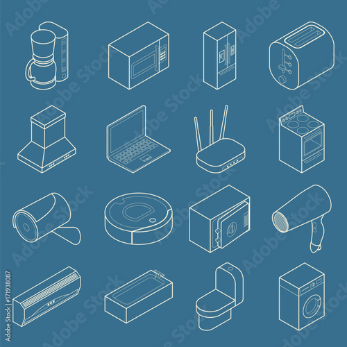 Vector smart home ikona v moderním stylu tenké čáry. Izometrické domácí spotřebiče a symboly počítačového vybavení, konstrukční prvky.