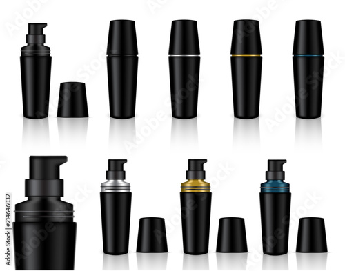 Vektorové sada sportovní výživy kontejnerových šablon izolovaných na bílém pozadí. Realistické černé plastové dózy, fóliové obaly a lahve na pití.