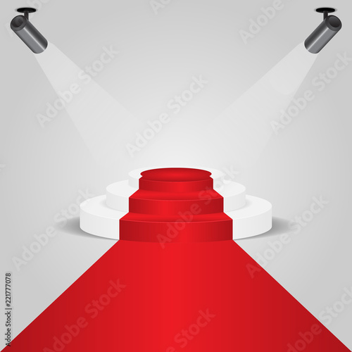 Reflektory a bílé kulaté pódium s červeným kobercem. Vektorové realistické ilustrace. Red carpet event design element.