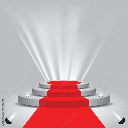 Bílé kulaté pódium s červeným kobercem osvětlené podlahovými reflektory. Vektorové realistické ilustrace. Podium spotlight pozadí.