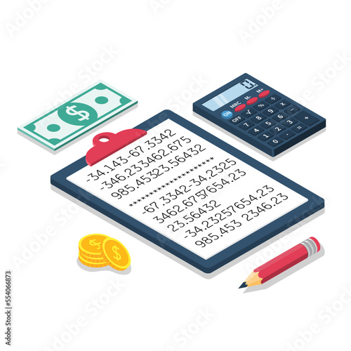 Vektorový daňový časový koncept designový prvek, realistické dřevěné pozadí. Připomenutí daňového času na kus papíru, plastovou bankovní kartu, kalkulačku, papírové peníze, mince, brýle a pero. Plochý styl ilustrace.