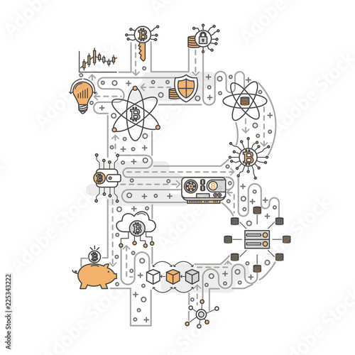 Bitcoin podepsat plakát banner šablona. Bitcoin digitální měna kryptoměna mining vektor tenká čára umění plochý styl designové prvky, ikony pro webové stránky banner a tištěných materiálů.