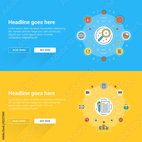 Trénink mozku vektor web banner šablony set. Knihovna, brainstorming, koncepce rozvoje tenké linie umění plochého stylu designových prvků.