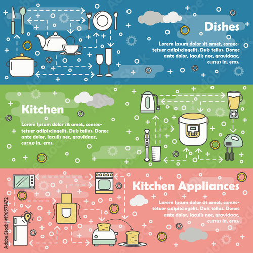 Mléčné vektorové web banner šablony set. Produkty, mléčné farmy a mléčné koncepty tenké linie umění plochého stylu designových prvků.