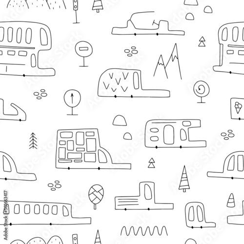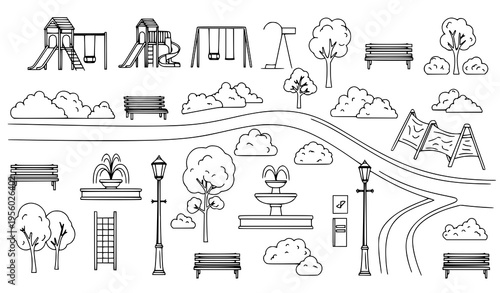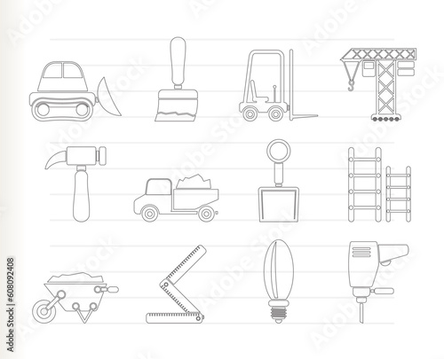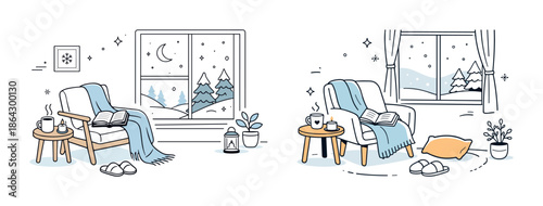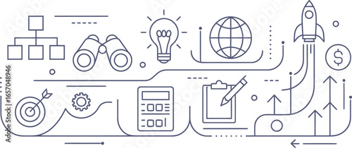 Bydlení plakát banner šablona. Interiér domu s nábytkem, garáž, auto, kolo, květinový záhon vektorové tenké linie umění plochý styl designové prvky, ikony pro webové bannery a tištěných materiálů.