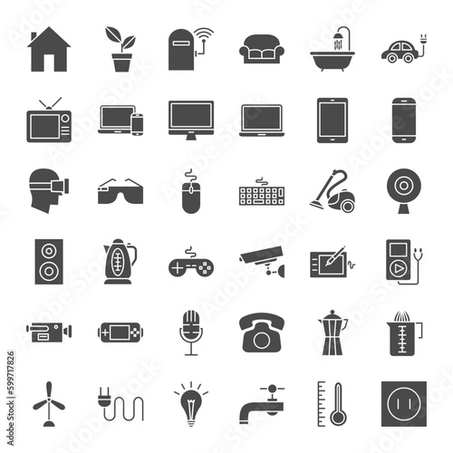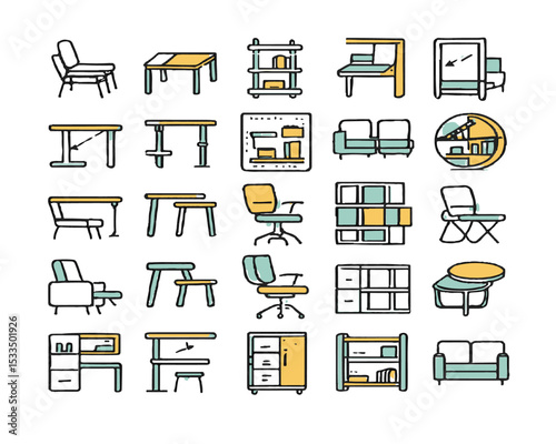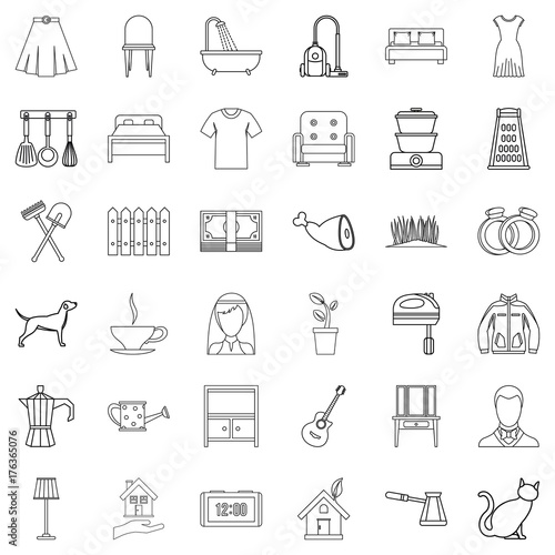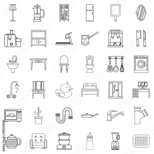 Vektorový Bezešvý vzor s interiérem domu s nábytkem, garáží, autem, na kole atd. Tenká linie umění plochý styl designu bydlení pozadí, tapety.