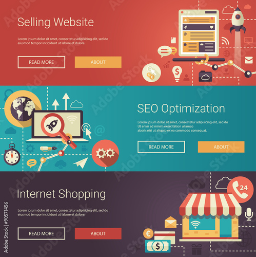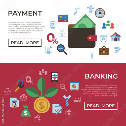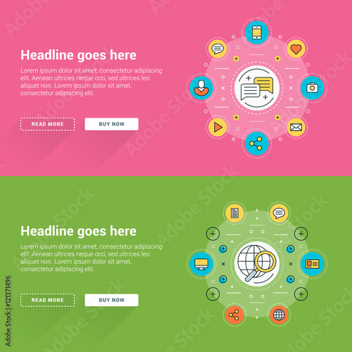 Sada šablon vektorového webového banneru. Mobilní bankovnictví, online nakupování a platební systémy koncept tenké linie umění plochý styl designové prvky.