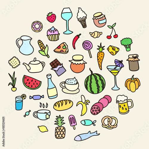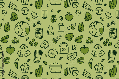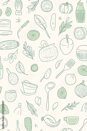 Vektorový Bezešvý vzor s čerstvými přírodními produkty rybí kuřecí maso mořské plody ovoce zelenina. Organické zdravé vaření, rychlé občerstvení. Tenká čára umění ploché správné jídlo pozadí, tapety