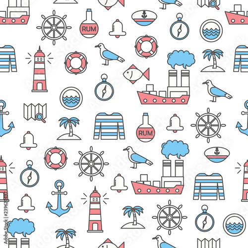 Vektorový Bezešvý vzor s námořními námořními navigačními symboly, doplňky námořního kapitána. Tenká linie umění plochý styl designu námořník pozadí, tapety.