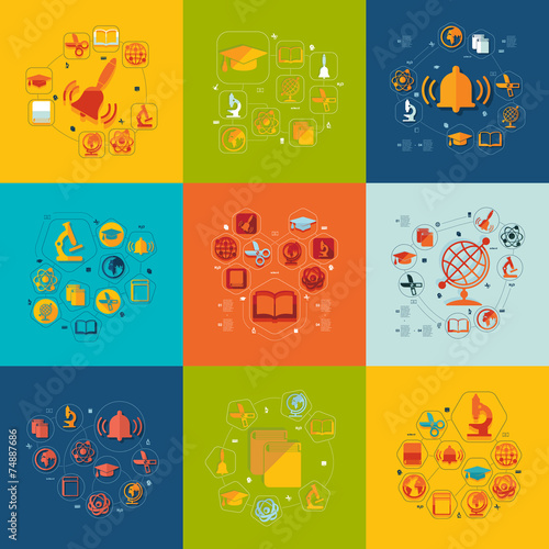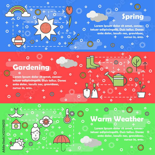 Sada šablon vektorového webového banneru. Jaro, zahradnictví, teplé počasí koncept tenké linie umění plochého stylu designových prvků.