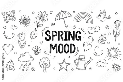 Jarní reklamní plakát banner šablona. Zahradní nářadí a oblečení, symboly jarní sezóny. Vektorové tenké čáry art ploché styl designové prvky, ikony pro webové stránky bannery a tiskovin.