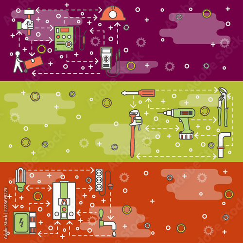 Video vektor web banner šablony set. Video a kino produkce tenká linie umění plochý styl designové prvky, ikony, kopírovat prostor.