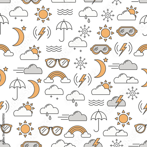 Vektorový bezproblémový vzor se symboly počasí, ikonami. Tenká linie umění plochý styl designu pozadí, tapety.