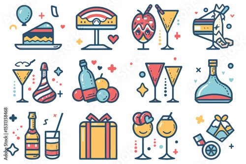 Vektorový Bezešvý vzor s prázdninovým dortem, květinami,dárky, šampaňským, balónky, botami na vysokém podpatku atd. Tenká čára umění plochý styl design ženy den pozadí, tapety.