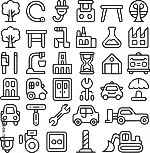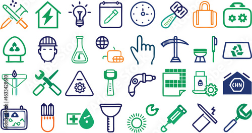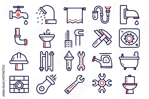 Vektorový bezproblémový vzor s elektrikářem, instalatérem, nástroji a vybavením stavitelů. Tenká linie umění plochý styl designu pozadí, tapety.
